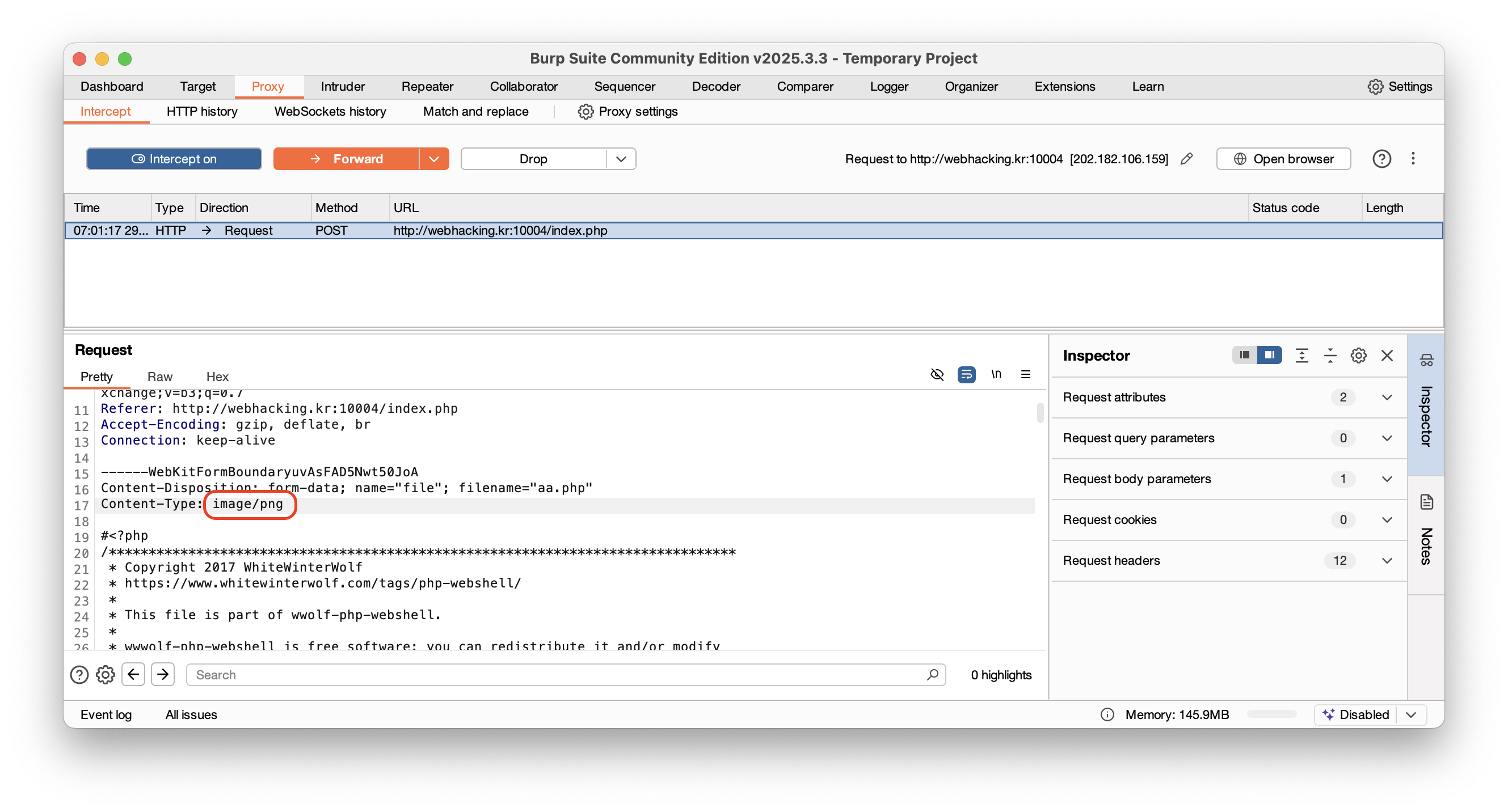 aa.php 파일을 올리고 제출을 누르면 사진과 같이 Content-Type이 text/php로 되어 있는데 이거를