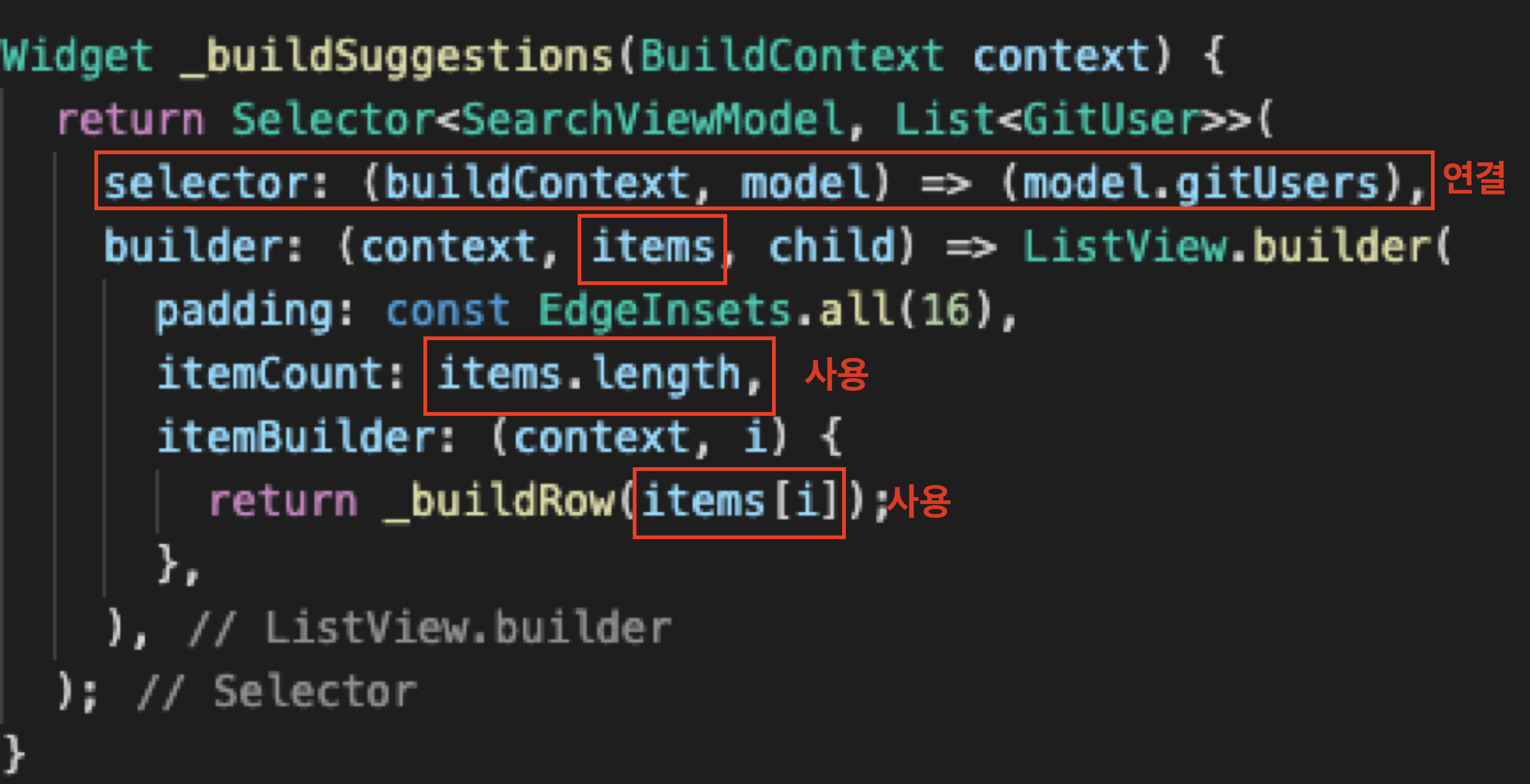 아래와 같이 Widget 내에서는 ViewModel을 연결하고, 해당 변수를 사용한다.
