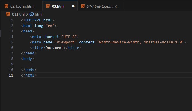 그러면 위 그림처럼 HTML의 가장 기초적인 뼈대가 자동으로 생성된다. 보이는 것처럼 HTML의 기본 뼈대는 크게 <html> 태그와 <head>, <body> 태그로 이루어져있다.