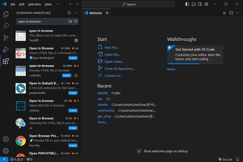 익스텐션 버튼을 클릭하면 설치하고싶은 익스텐션을 검색할 수 있다. 여기서 검색해서 자신에게 필요한 익스텐션을 손쉽게 설치할 수 있다. 그냥 Install 버튼을 클릭하기만 하면 된다. 아래 목록은 많은 사람들이 사용하는 추천 익스텐션 목록들이다. 읽어보고 자신에게 필요한 것들을 설치하면 된다.