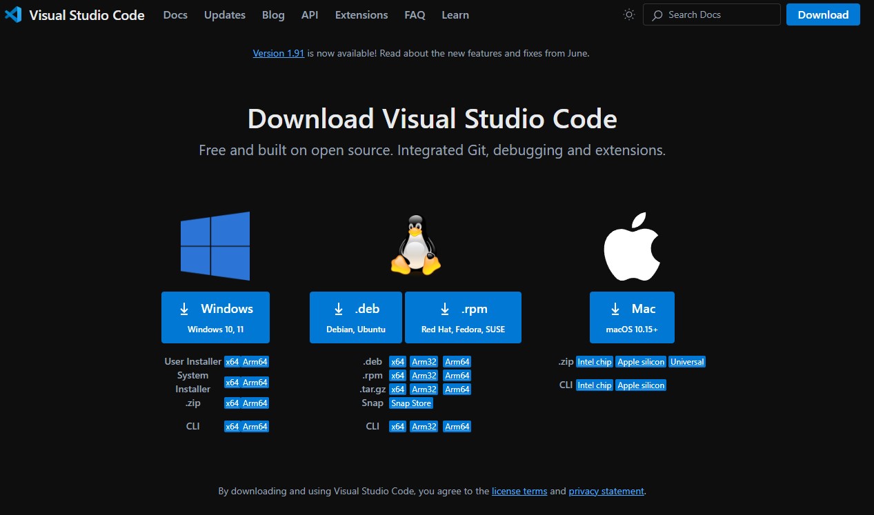 VSCode(Visual Studio Code) - MicroSoft사에서 개발한 에디터이다. 아래 링크에 접속해서 쉽게 다운로드 받을 수 있다. 본인의 운영체제에 맞는 버전을 다운받아서 사용하면 된다.