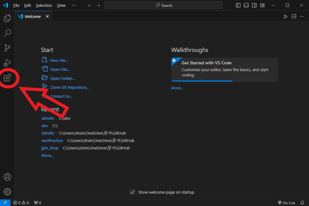 설치하고 나서 실행하면 위 사진처럼 익스텐션(Extensions; 추가기능)을 설치할 수 있는 버튼이 있다.