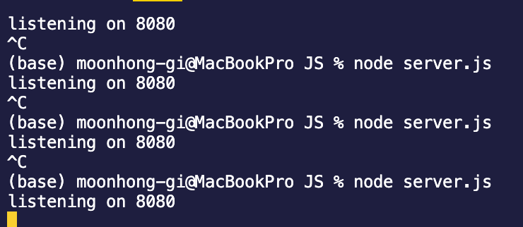 콘솔에 listening on 8080을 출력하는 함수까지 정상적으로 실행됨.