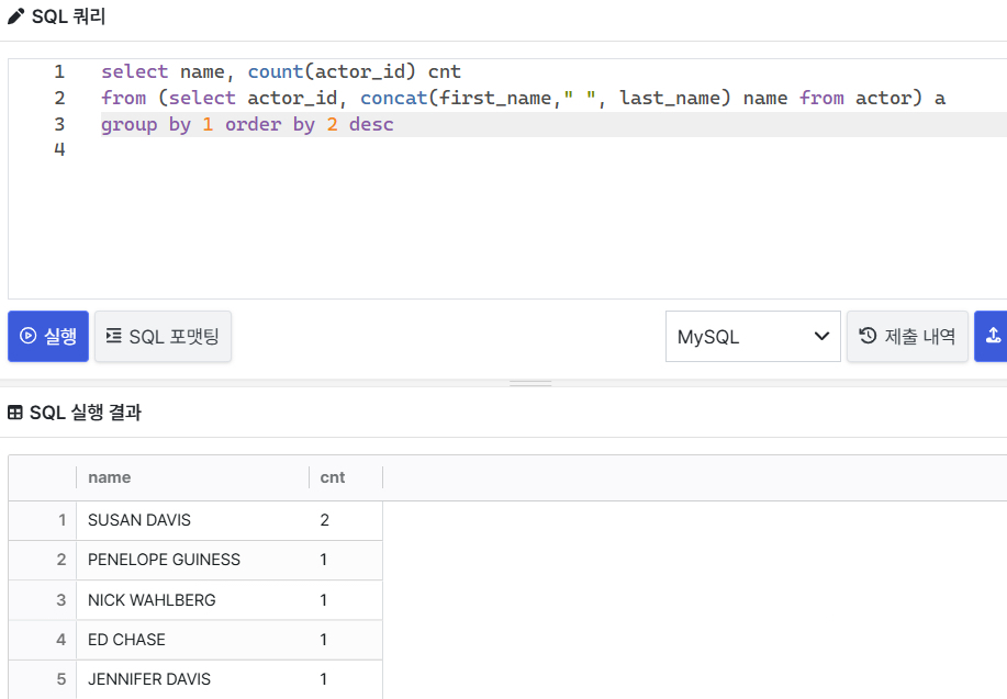 실제로 name으로 group by해서 actor_id 개수를 세면 Susan Davis만 두 명인 것을 확인 가능하다.