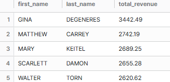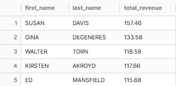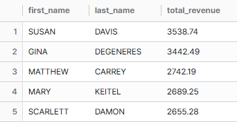 어찌저찌 제대로 된 total revenue를 찾아냈으나, 여전히 Susan Davis가 첫 행에 뜬다. 앗 맞다 actor_id...