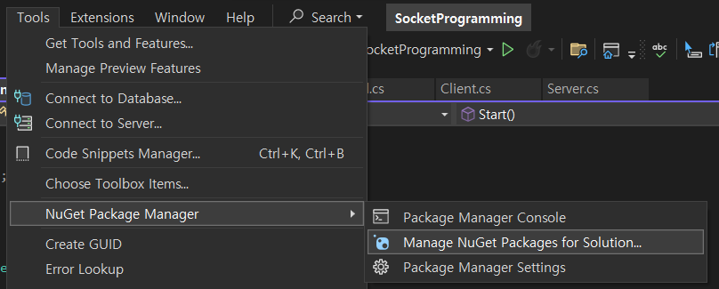 프로젝트 상단의 [Tools - NeGet Package Manager - Manage NuGet Packagesfor Solution...] 을 눌러 오픈 소스 패키지를 설치할 수 있다.