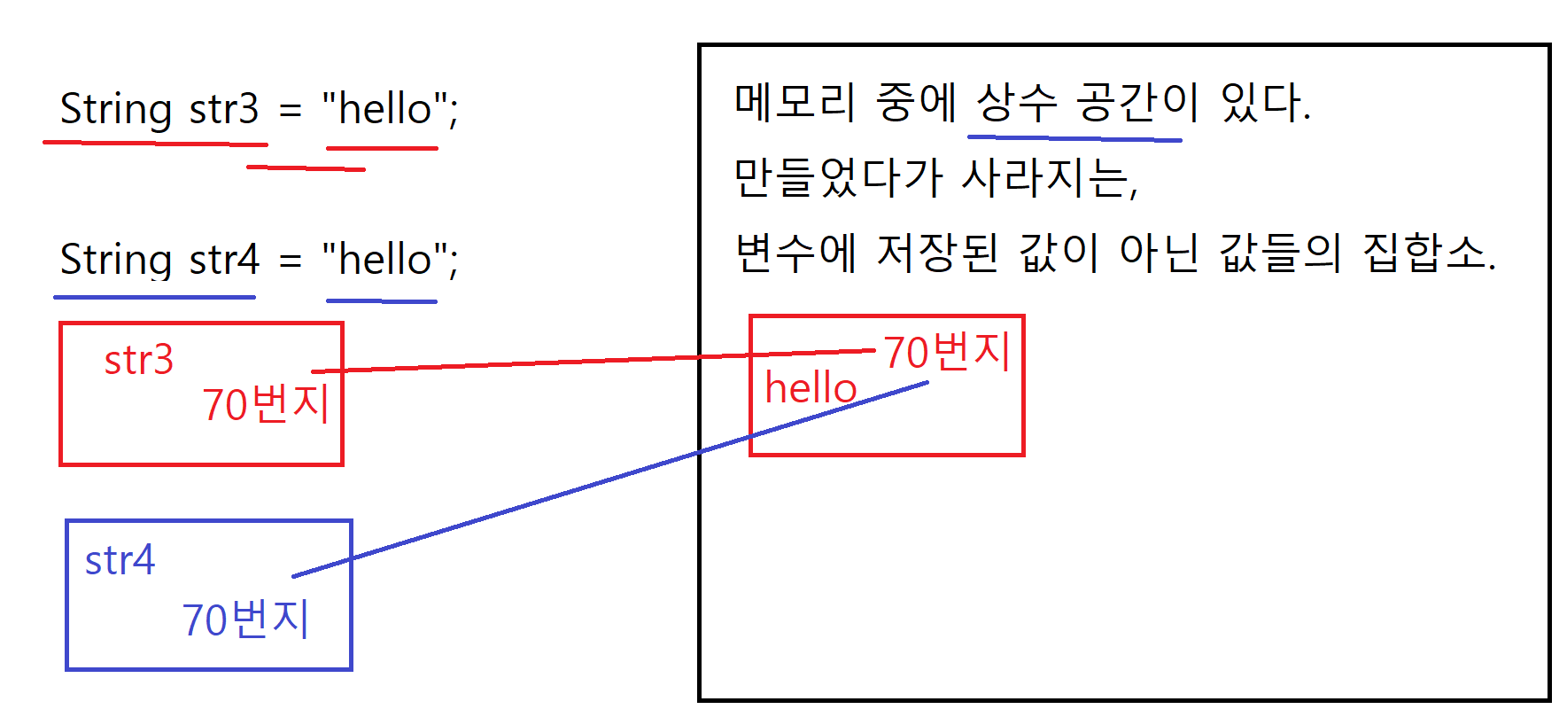 프로그램은 재활용이 최우선이기에 똑같은 문자열을 사용할 경우 주소값 70번지에 있는 문자열을 재활용한다. str3 == str4