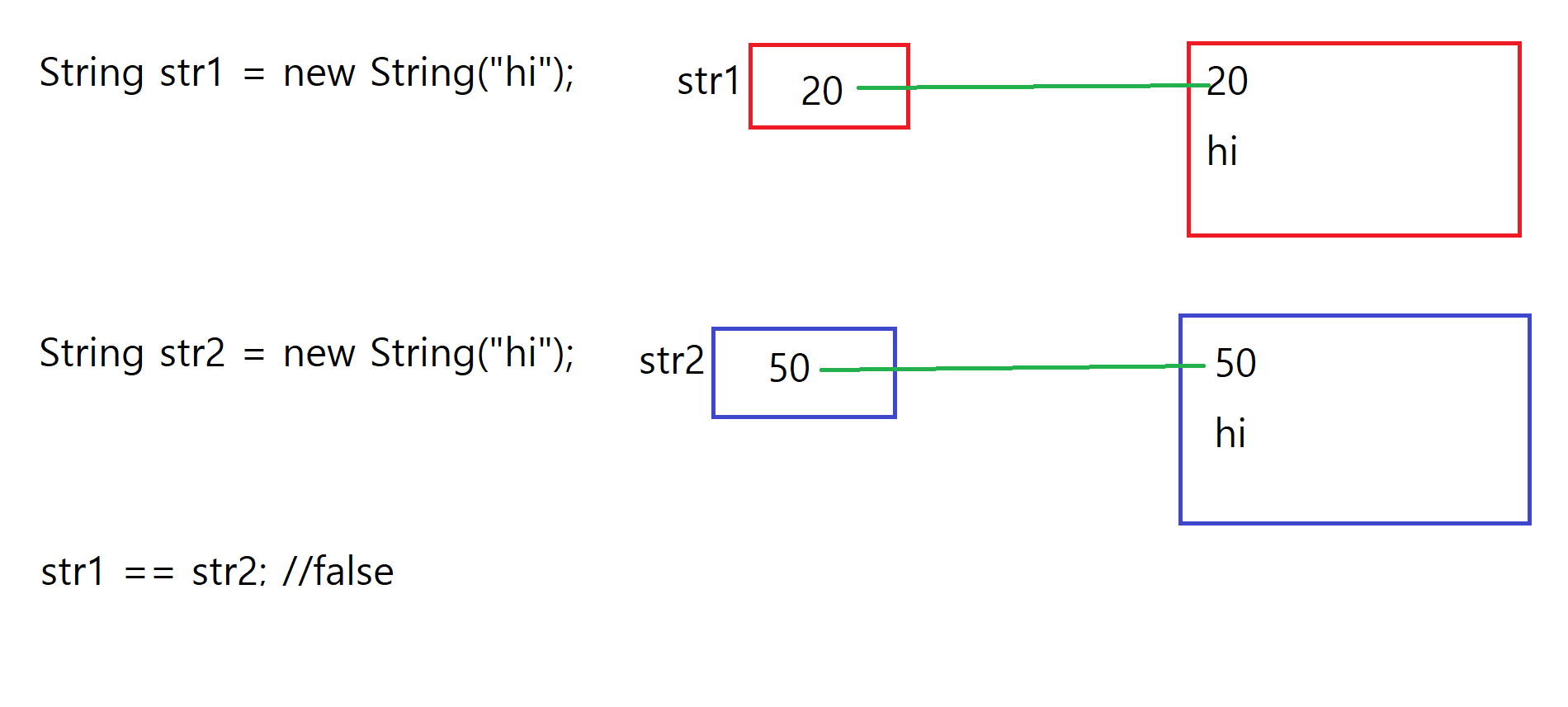같은 문자열일지라도 new 객체 생성을 했으므로