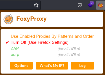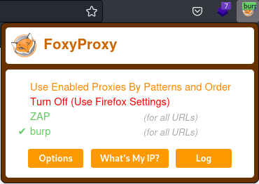 10.) 파이어폭스 브라우저의 FoxyProxy를 burp on 해준다.