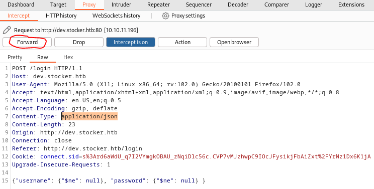 14.) Content-Type에 밑에 코드를 입력하고 Forward를 계속 해준다.