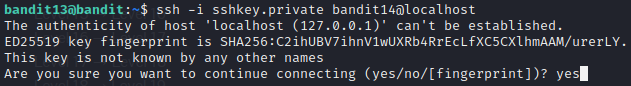 - ssh 다음 RSA로 되어 있는 비밀키를 쓸 것이기에 -i라는 옵션을 주고, 비밀키 파일 이름을 적어주고, 다음으로 넘어갈 bandit14@를 적은뒤에 현재 bandit13에서 로그인을 하는 것이니 localhost를 적어준다.