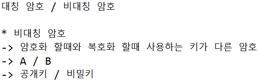 - A라는 키는 암호화 할때 사용하고, B라는 키는 복호화 할때 사용하는걸 비대칭 암호라고 한다.