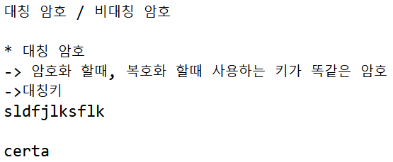 - sldfjlksflk를 암호화 할때, 비밀key가 certa일경우 암호화 된 파일을 읽을려면 certa라는 비밀key를 입력해줘야 한다. 이때 certa는 대칭키 이고, 대칭 암호라고 한다.