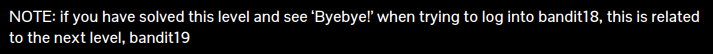 - 문제를 다시보면, 이번 레벨에서 문제를 풀고, bandit18으로 로그인을 하면, Byebye가 뜨고 종료가 될거야 그런데, 이거는 그 다음 문제랑 관련이 있으니까, 잘 해결을 한게 맞다. 라고 적혀있다.