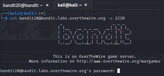 bandit20으로 로그인한 터미널을 2개로 만들어 준다.