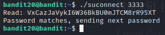 자, 이제 포트 번호를 열어두고 기다리던 터미널에서 bandit20 비밀번호를 넣고 다른 터미널에 보내주면, suconnect의 자기의 비밀번호를 전달해줄 것이다.