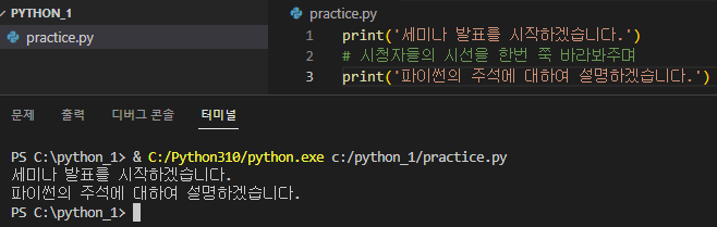 예를들어 코드가 사진처럼 적혀 있었다고 하면 2번째 문장은 주석이므로