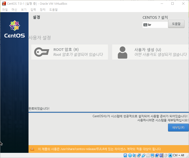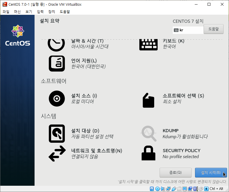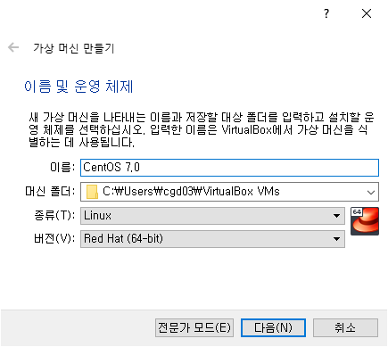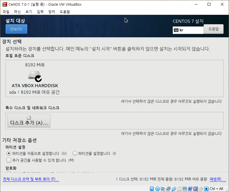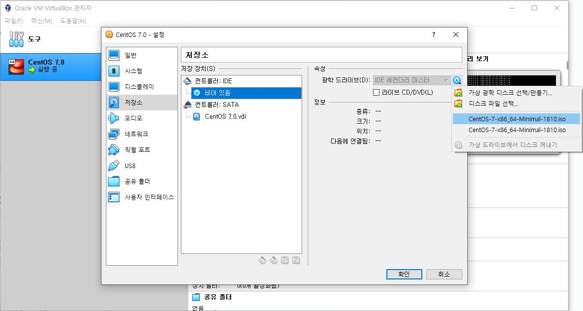 저장소 : 컨트롤러 : IDE - 광학드라이브(D) 에 CentOS-7xxx.iso 압축파일 추가