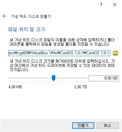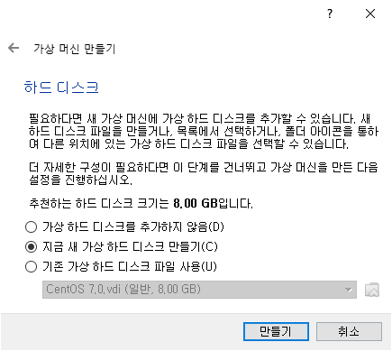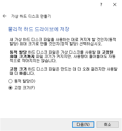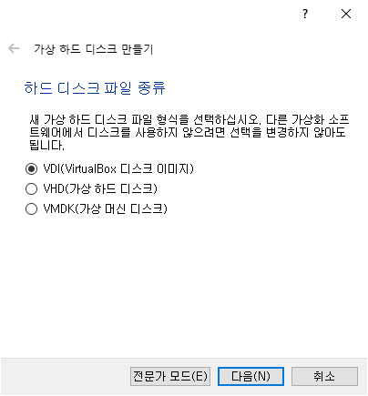 하드디스크 파일 종류 : VDI(VirtualBox 디스크 이미지)
