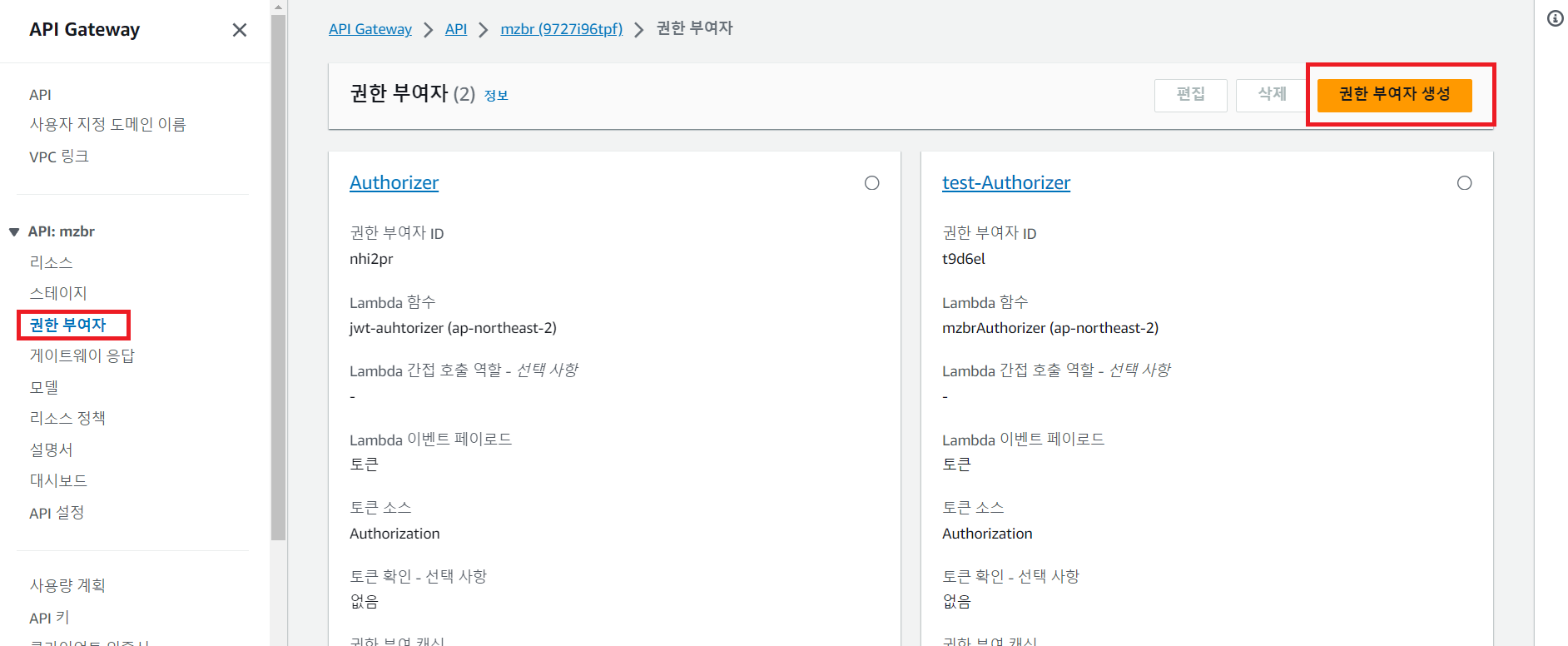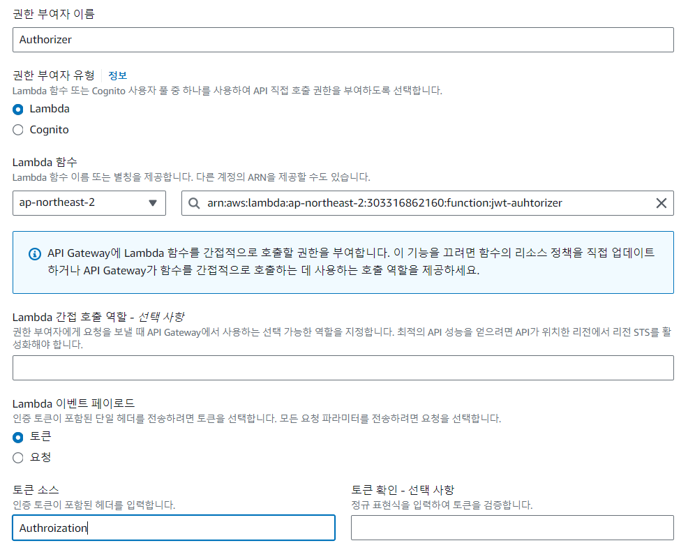 이름을 입력하고 권한 부여자에서 사용할 Lambda 함수를 등록한다.