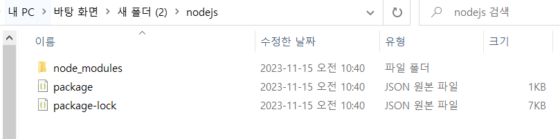 바탕화면에서 node.js 폴더를 생성하고 내부에 node_modules 폴더를 생성한다.