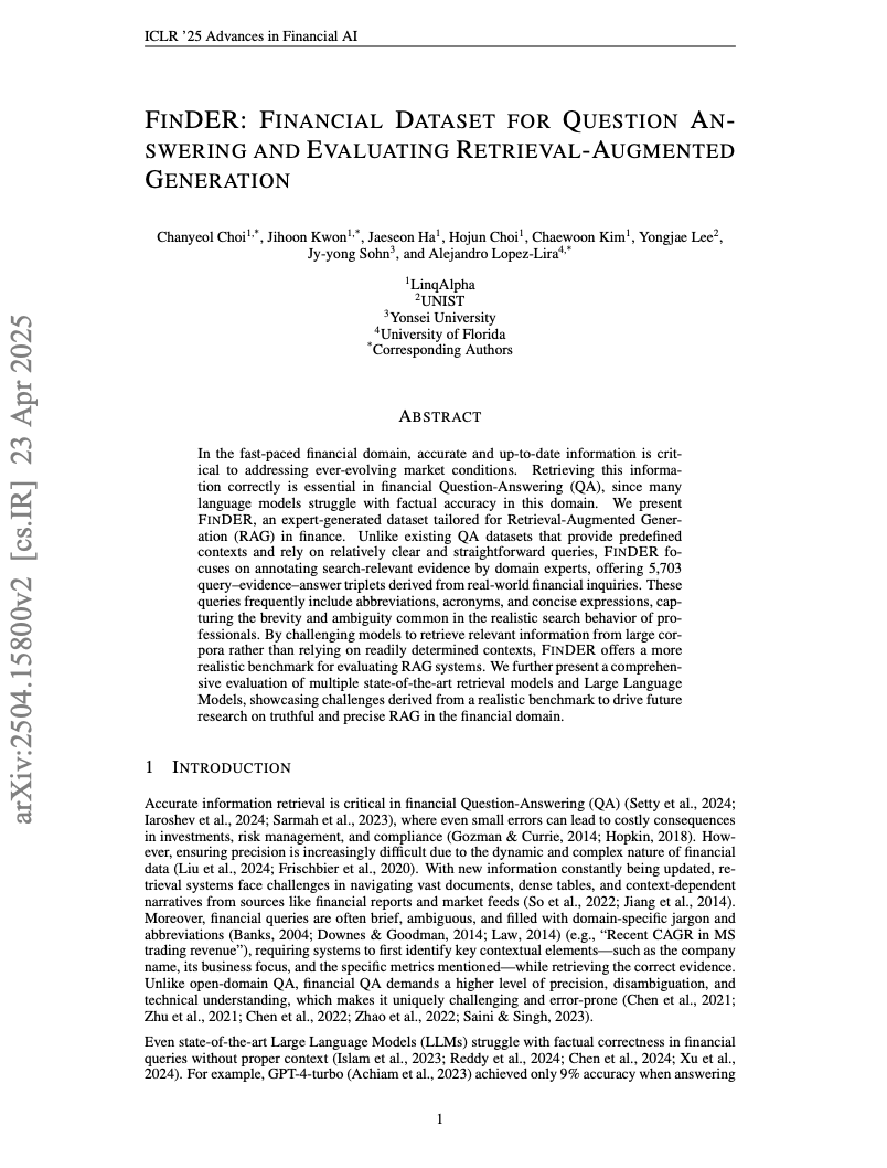 - Title: FinDER – Financial Dataset for Question Answering and Evaluating Retrieval-Augmented Generation