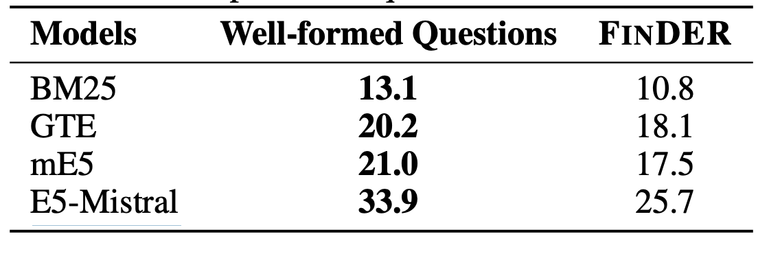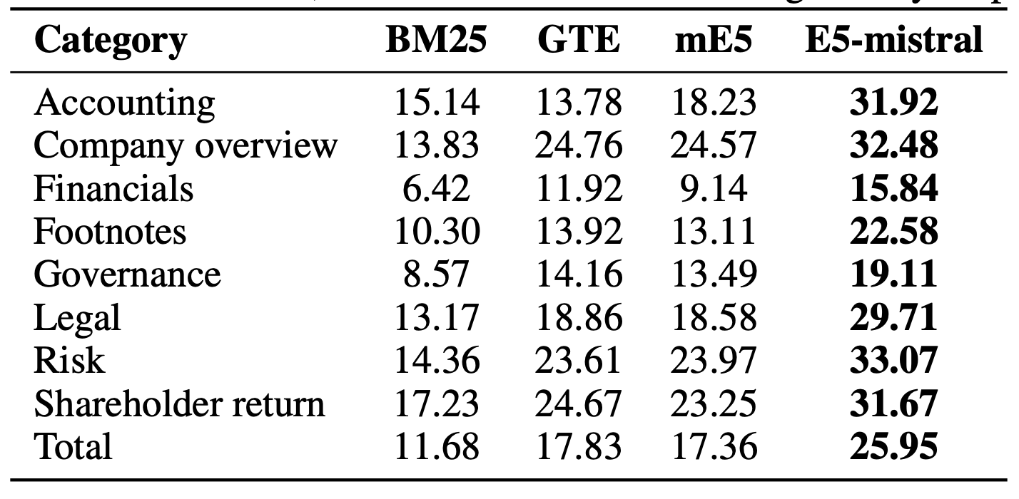 - E5-Mistral이 BM25 대비 2배 이상 우수