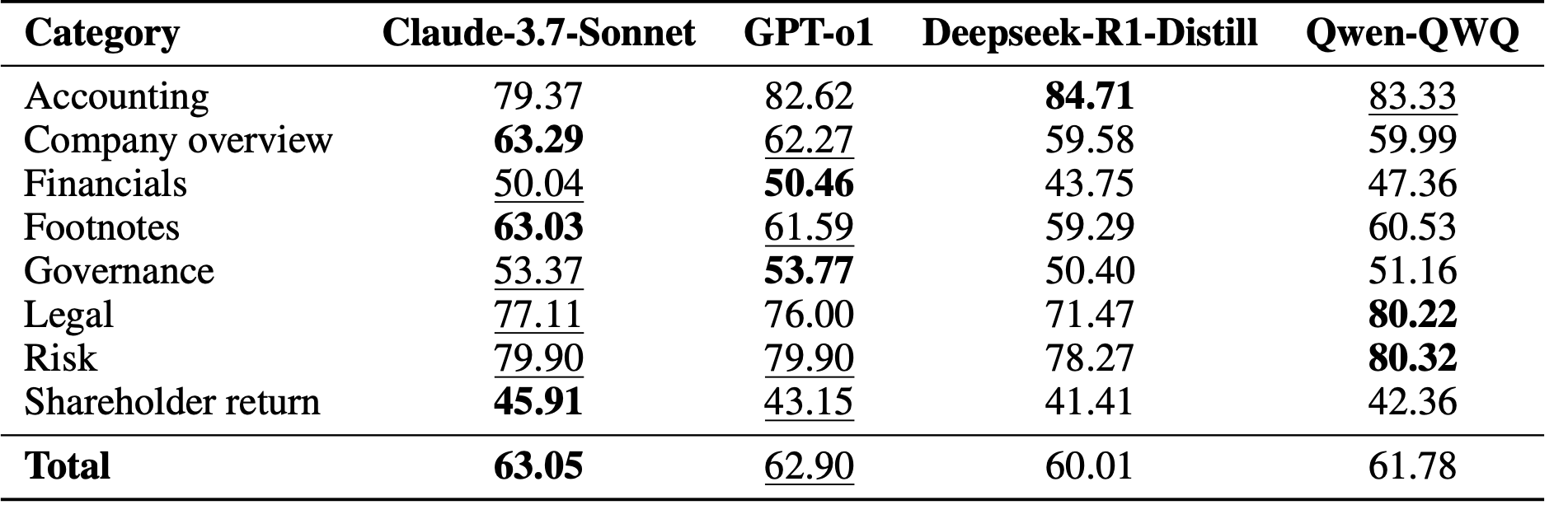 - 전체 F1: Claude-3.7 (63.05), GPT-o1 (62.90), Qwen (61.78), Deepseek (60.01)