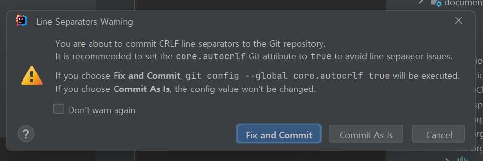 결론적으로 Window에서 사용하는 줄바꿈 방식과 maxOS, Linux에서 사용하는 줄바꿈 방식이 달름으로 Git에서 core.autocrlf를 true로 사용하면 줄바꿈을 git에서 자동으로 관리해준다. 그럼으로 Fix and commit을 사용하면 되더라.