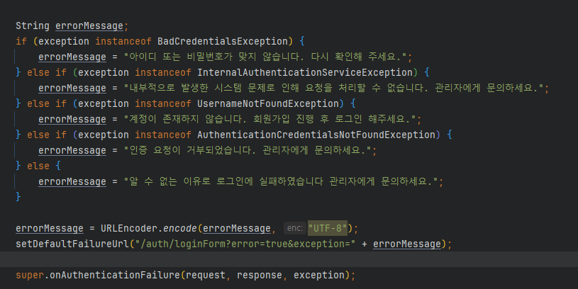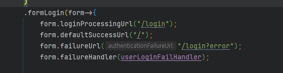 하지만 이래도 해결되지 않았고, 추가적 원인으로 userLoginFailHandler 설정이 덮어쓰고 있다고 생각되어 Handler를 수정