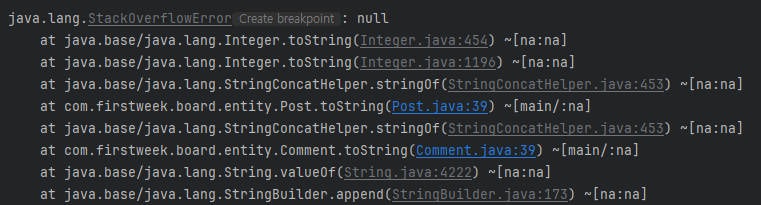 해당 entity에서 post를 출력하게 되어있어 서로 무한 참조가 되는 원인을 발견하고 post를 제거했다