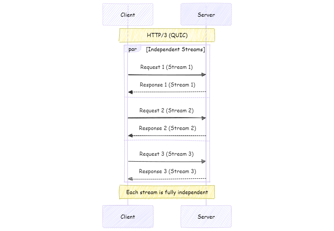 이 흐름은 HTTP/1.1 기준이며, HTTP/2나 HTTP/3에서는 일부 단계가 최적화되거나 병렬로 처리된다