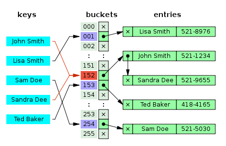 동일한 버킷에 저장되어야 하는 데이터에 자료구조Linked List / Tree를 사용해 체인을 걸어, 추가 메모리를 사용해 다음 데이터의 주소를 저장해 놓는 방식이다.