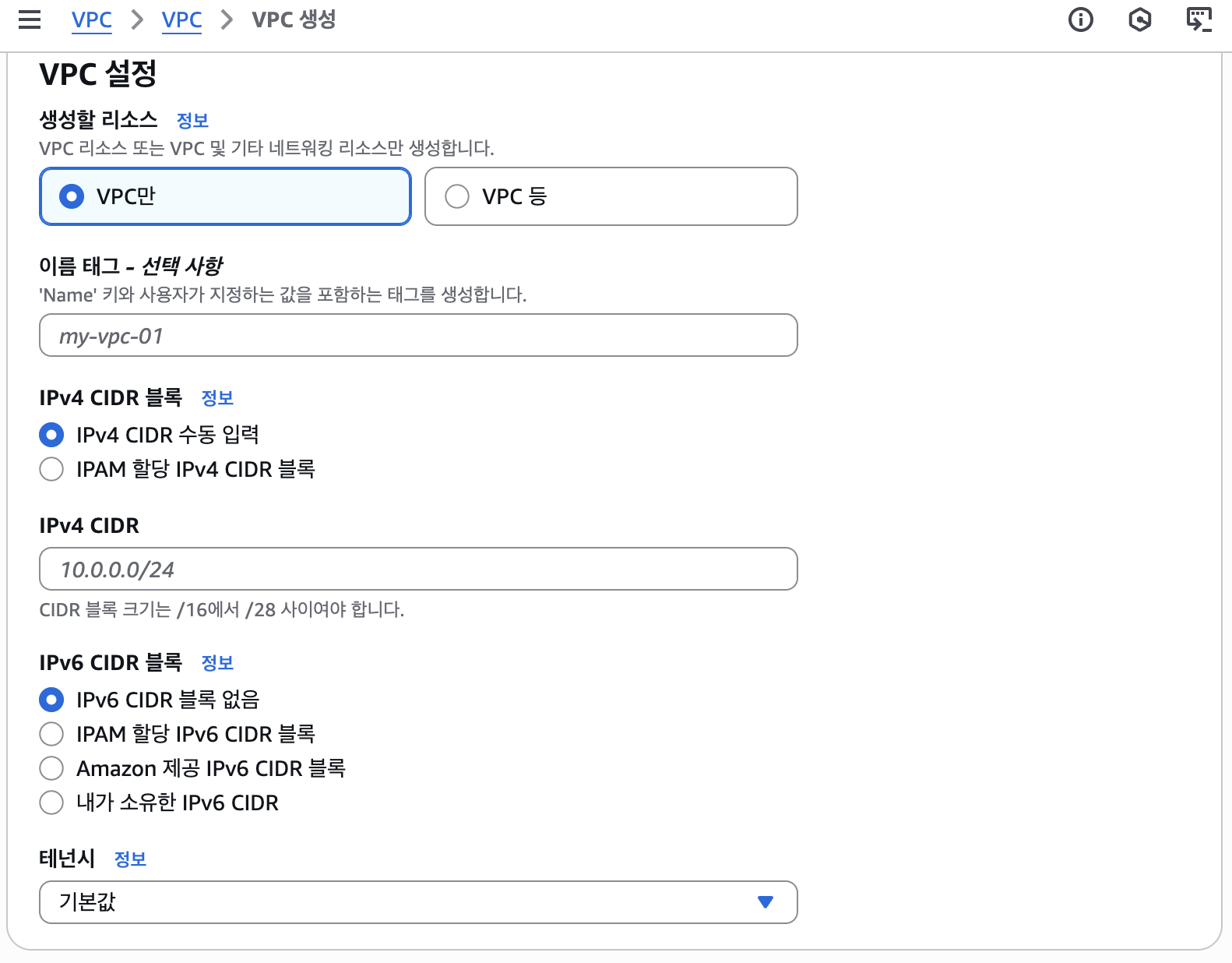 우선 VPC를 생성한다. ex) 10.0.0.0/16