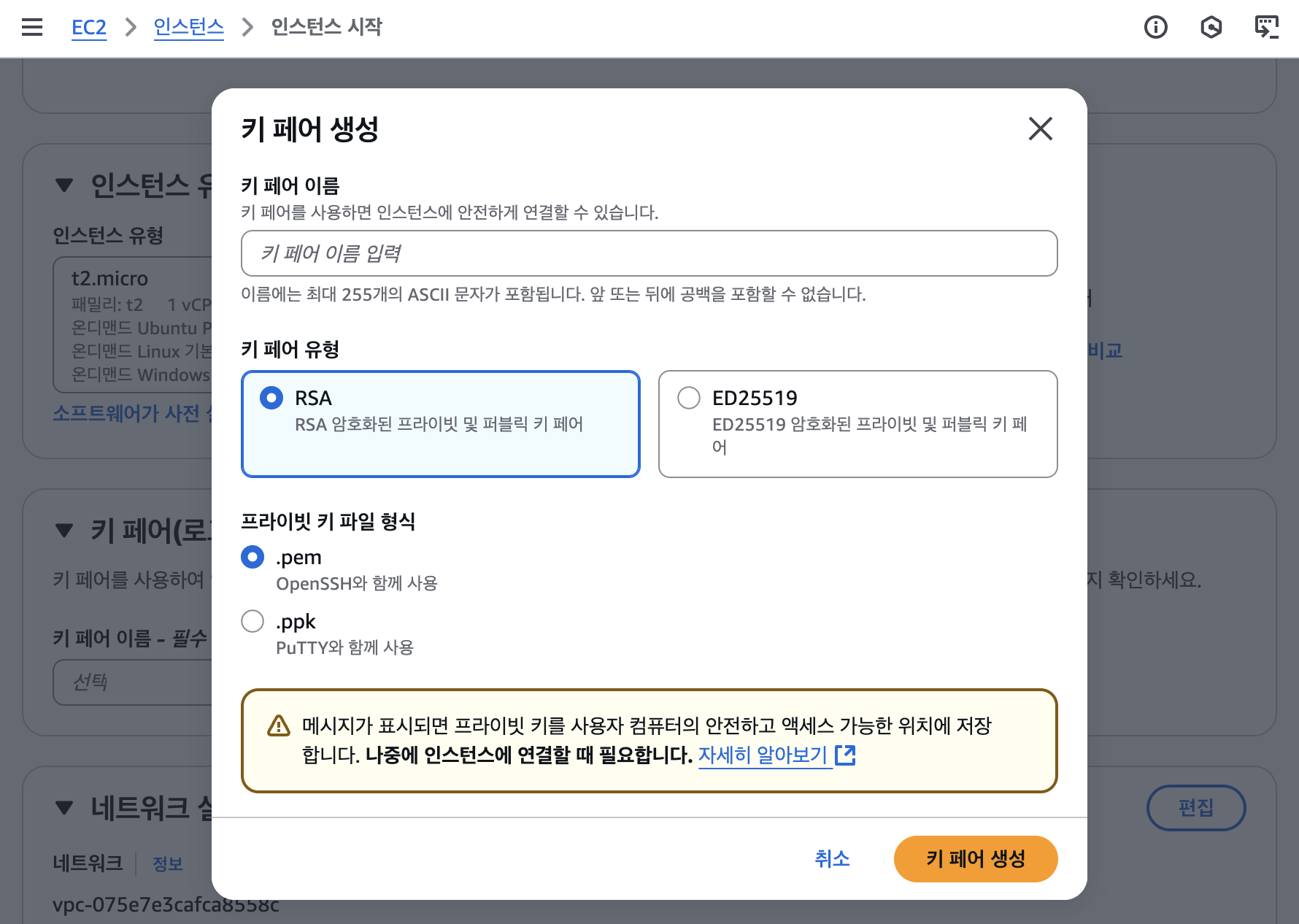 키페어는 RSA & .pem 으로 생성해준 다음에 적절한 위치에 잘 이동시켜둔다.