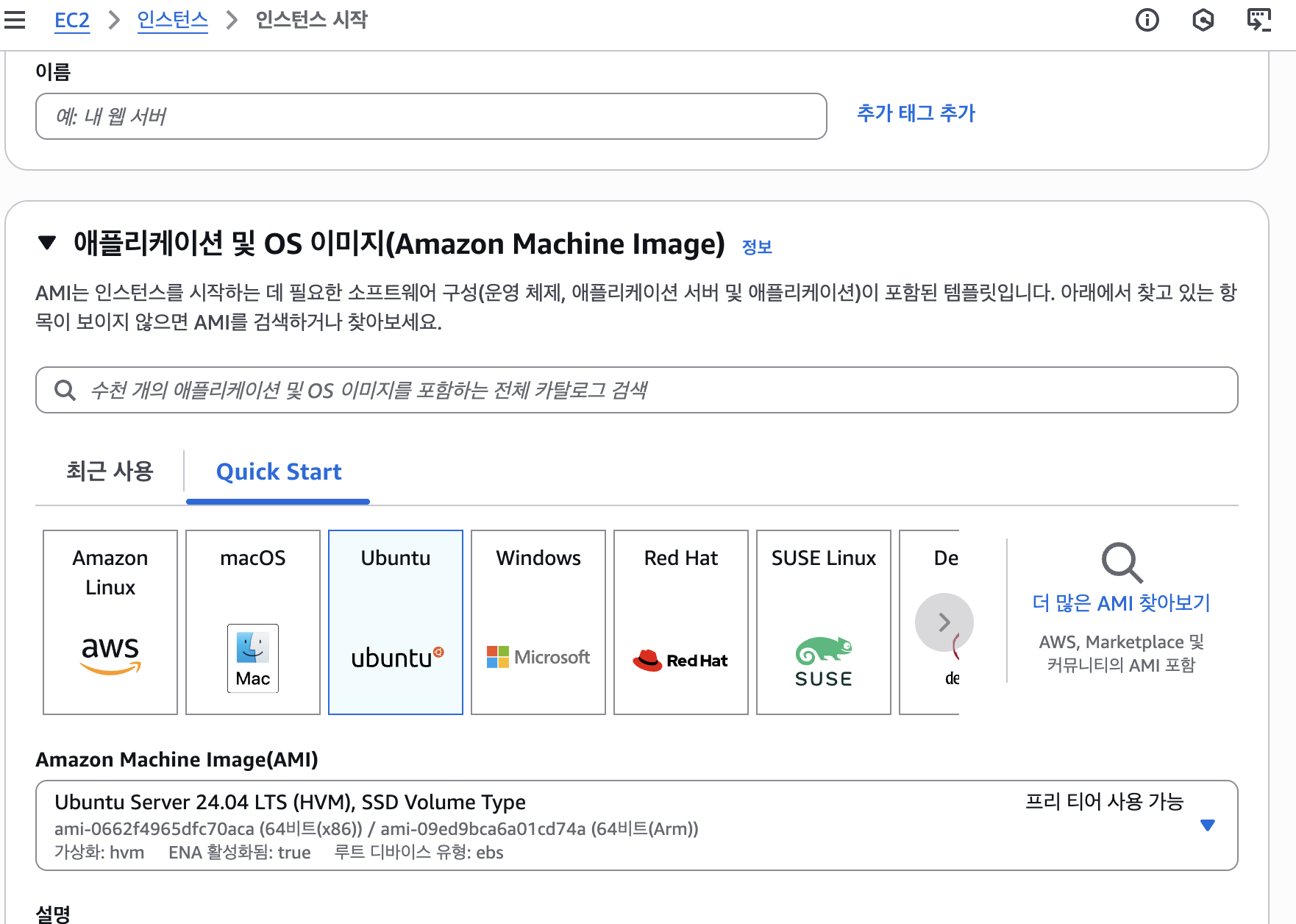 나는 프리티어를 사용할 것이기 때문에 적절한 인스턴스 이름으로 작성해주고 Ubuntu로 할 것이다.