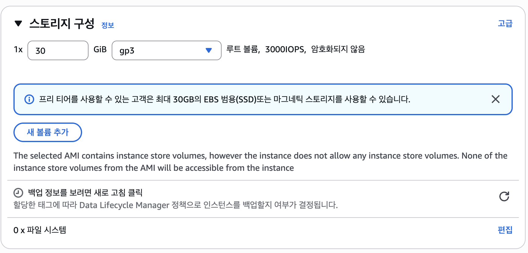 마지막으로 스토리지 설정을 해주면 되는데 프리티어는 30GiB까지 지원해준다. 나중에 변경 가능하긴 한데 그냥 처음부터 해두는게 편하다.. CPU 넘치고 난리나면 EC2 접속이 안돼서 힘들어짐