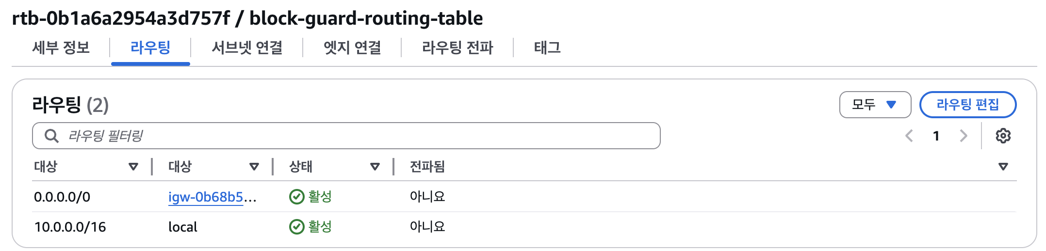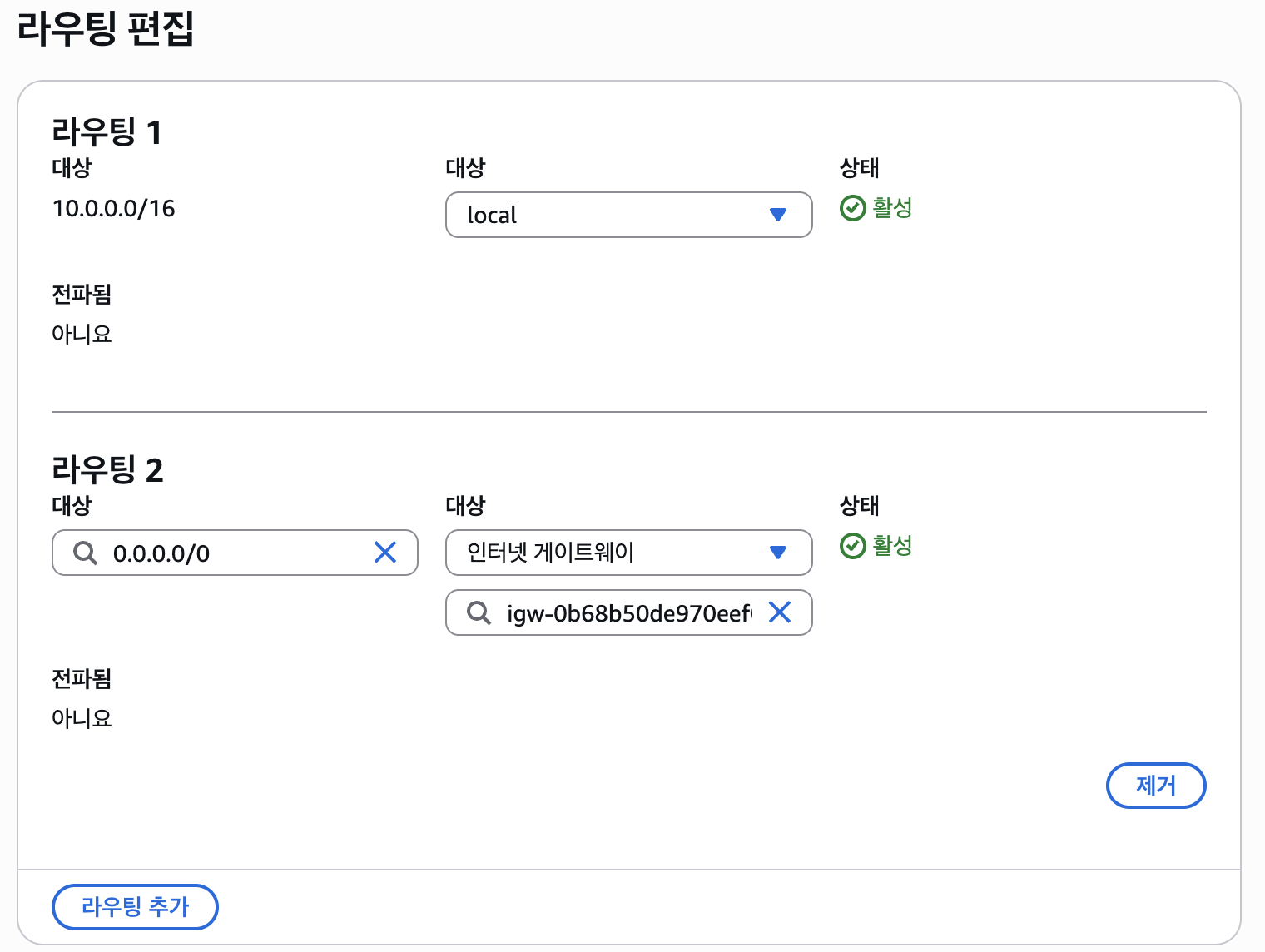 만든 후에는 라우팅 편집을 눌러 0.0.0.0/0과 만들었던 인터넷 게이트웨이를 추가하고 변경 사항을 저장한다. 이 의미는 10.0.0.0/16 CIDR 블록을 제외한 접근에 대해서는 인터넷 게이트웨이로 라우팅 한다는 뜻이다.