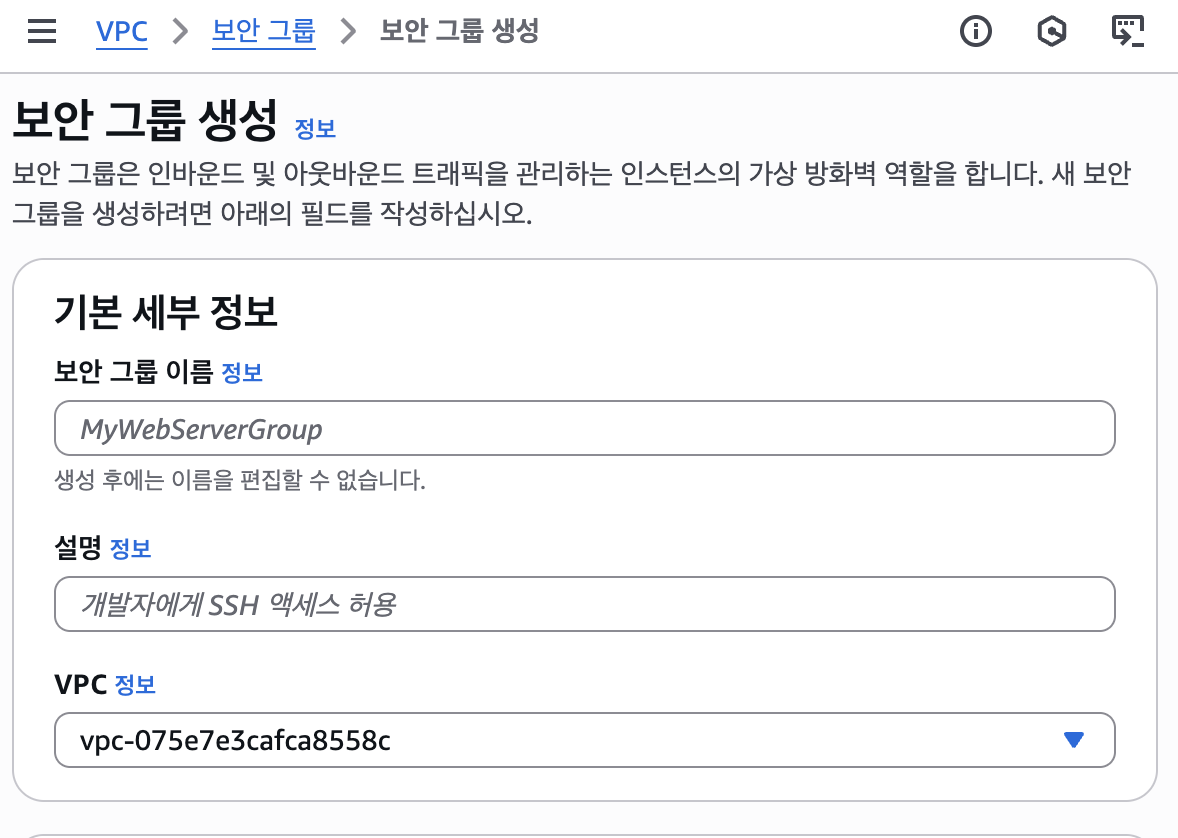 EC2를 생성할 때 만들어도 되지만 미리 만들어놓고 들어가겠다. 나중에 private 보안 그룹도 만들거기 때문에 public 인 경우는 이름에 public이라고 명시하는게 편하다.