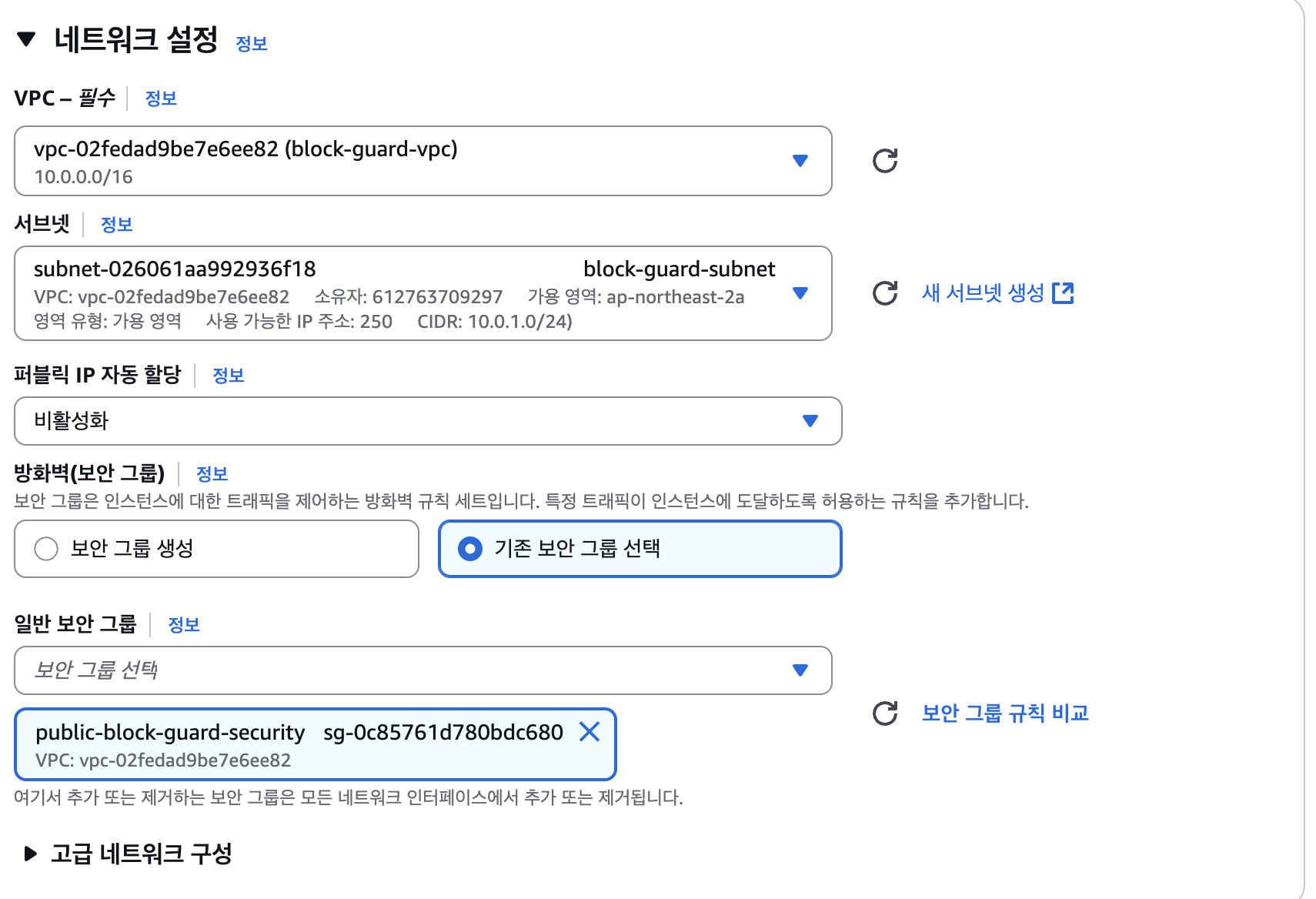 네트워크 설정은 만들어둔 VPC를 설정해주고, 서브넷도 만들어둔 public subnet을 선택한다. 그렇게 되면 만들어놓은 보안그룹이 나올 건데 해당 보안그룹으로 설정해준다.