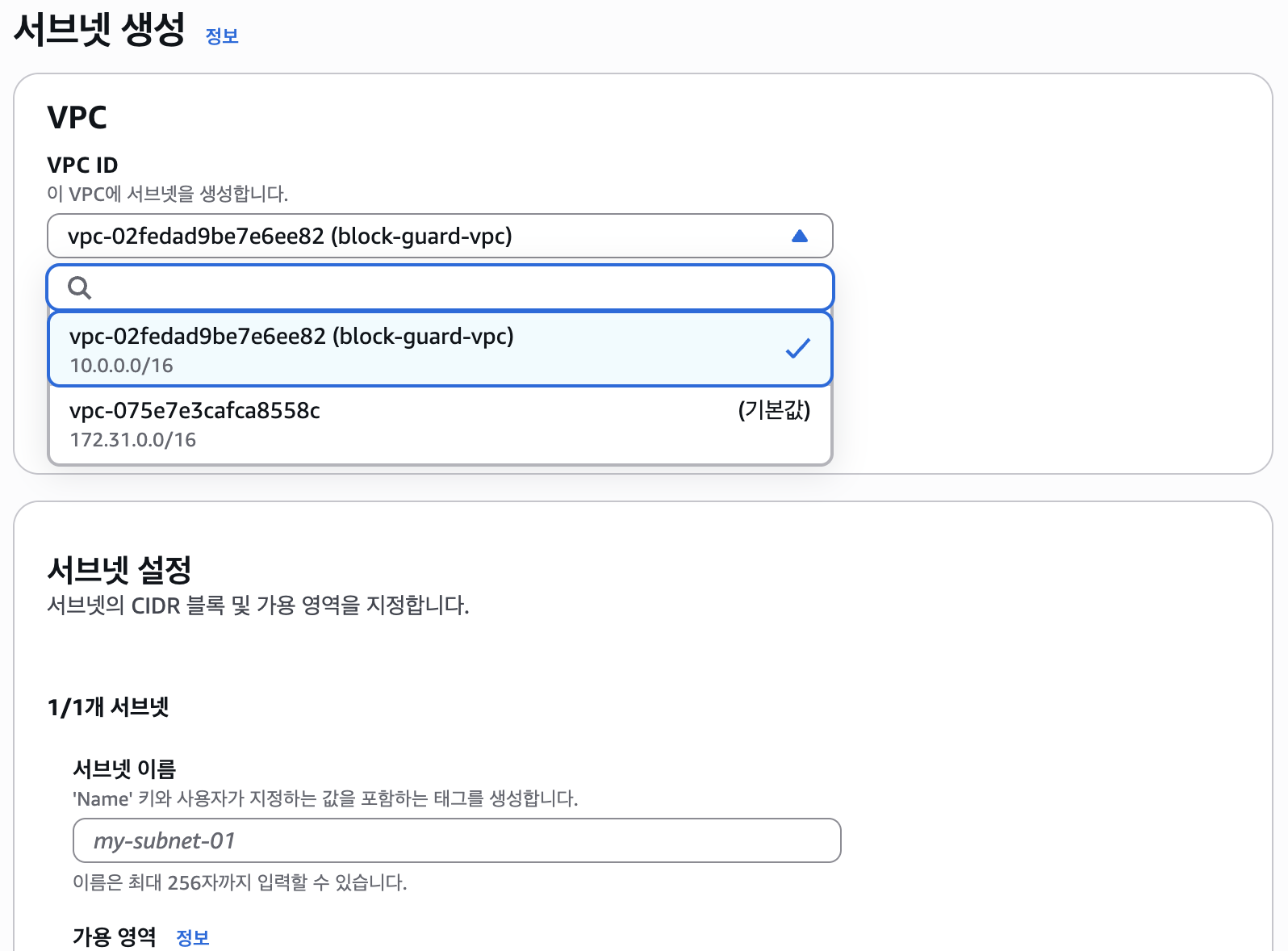 1번 단계에서 만들어놓은 vpc 를 선택해서 public subnet을 생성해준다.