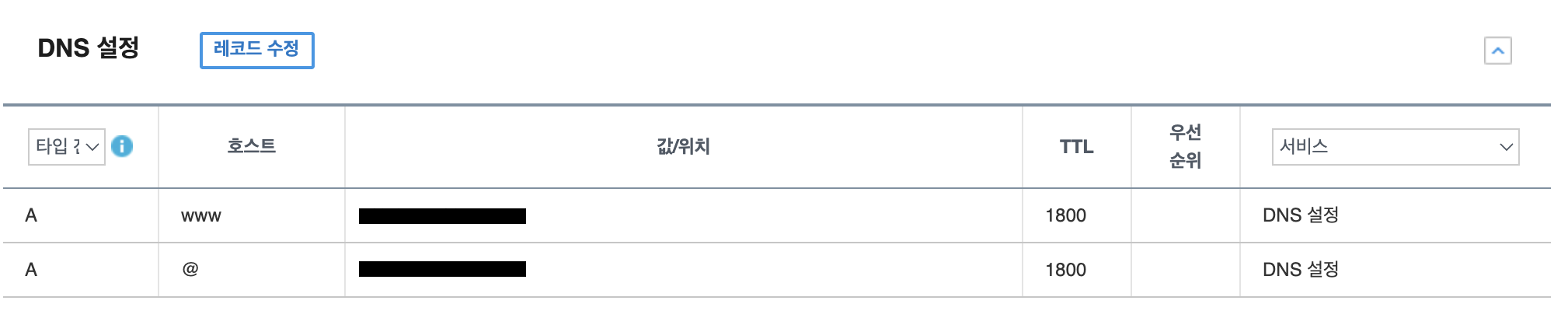 원하는 도메인 구입 후에 도메인 설정에 들어간다. 사진과 같이 설정하면 되는데 값/위치에는 EC2의 IP주소를 기입한다.
