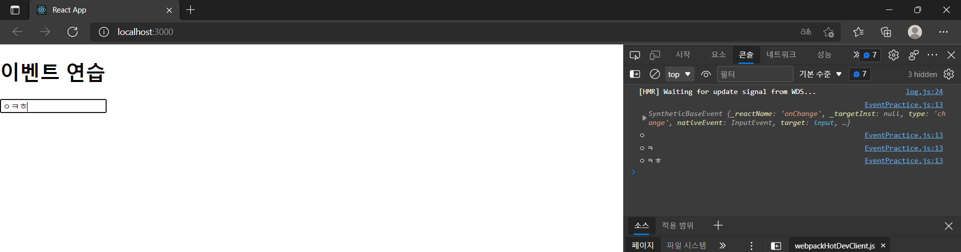 SyntheticEvent로 웹 브라우저의 네이티브 이벤트를 감싸는 객체. SyntheticEvent는 네이티브 이벤트와 달리 이벤트가 끝나면 이벤트가 초기화. e.persist()함수를 호출해야 함.🧐 만약 값이 변할 때마다 인풋 값을 콘솔에 기록하고 싶다면?