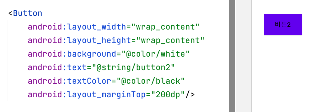 또 하필 보라색인 이유는 backgroundTint의 기본값이 보라색이기 때문이다. 그래서. backgroundTint만 설정해주었을 때는 색상이 맞게 나오는 것을 볼 수 있다.