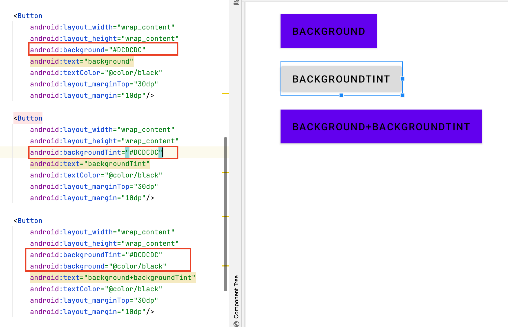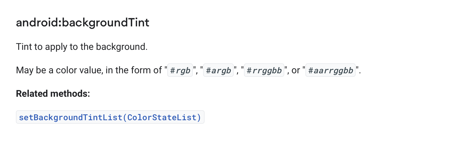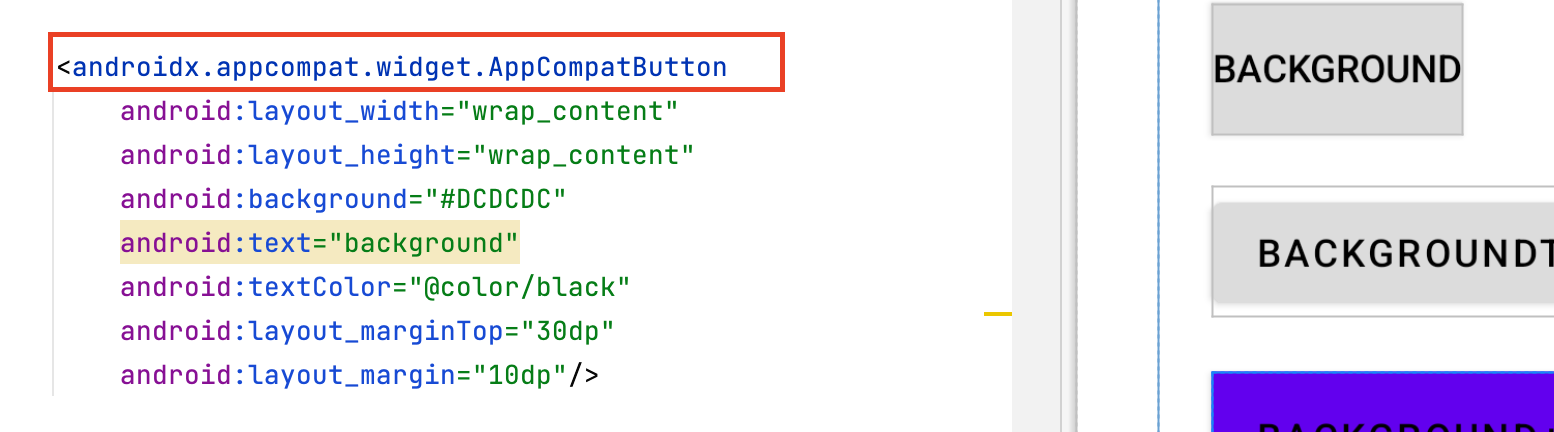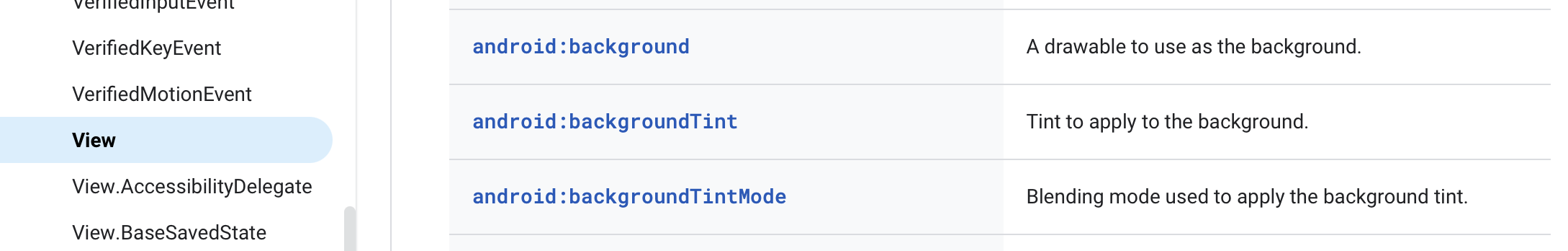 버튼의 색상을 지정하는 속성 background, backgroundTint는 모두 View 클래스의 XML 속성(Attributes)이다.