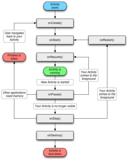 - 안드로이드 응용프로그램은 화면이 작아 동시에 여러 개의 액티비티가 나올 수 없다