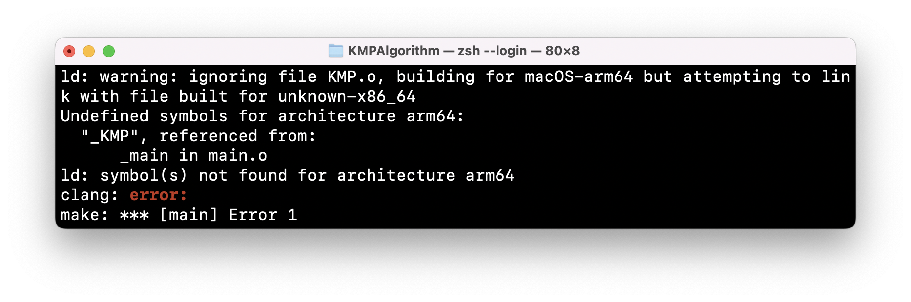 KMP.o 파일이 무시되었다. 그 이유는 macOS-arm64로 빌드를 하는데 x86-64로 빌드해야 하는 파일을 링크하려고 했기 때문이다. 그리고 그 파일이 바로 KMP.o 이므로 무시되었다. 당연히 KMP.o 이 무시되었기 때문에 해당 소스코드가 포함되어야 할 main이 실행되지 못해서 결론적으로 link 오류가 난 것이다.