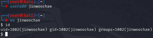 위 사진과 같이 jinwoochae 라는 계정으로 이동하면 모양이 조금 바뀐 걸 확인할 수 있다. 이 때 이 계정의 id 정보를 보면 uid,gid 번호가 동일한 것을 확인할 수 있는데, 이유는 계정을 생성할 때 어떤 그룹인지 따로 지정을 하지 않았기에 jinwoochae 라는 계정의 이름 그대로 아이디를 생성한 뒤, 그룹으로 부여된 채 계정이 생성되었기 때문이다.