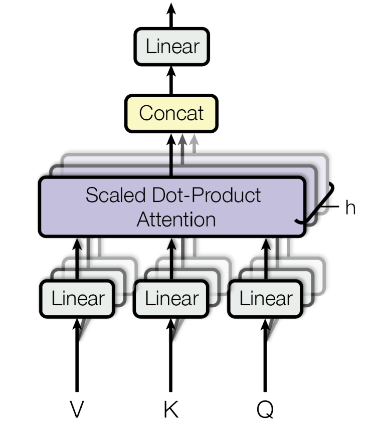 Each head then applies scaled dot-product attention in parallel: