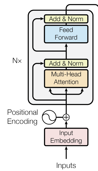 Since the model has no recurrence or convolution, it needs a way to represent the order of tokens. To achieve this, sinusoidal positional encodings are added to the input embeddings at the bottoms of the encoder and decoder stacks: